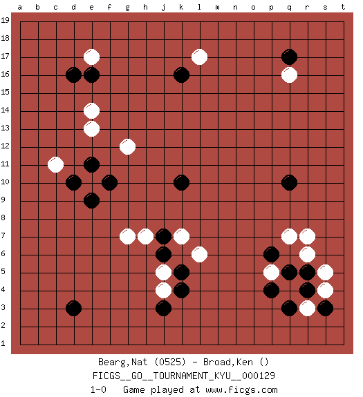 Last move : 1-0 2011 October 22 1:0:6 [Event "FICGS__GO__TOURNAMENT_KYU__000129"] [Site "FICGS"] [Date "2011.10.15"] [Round "1"] [Black "Bearg,Nat"] [White "Broad,Ken"] [Result "1-0"] [Rating 1 "0525"] 1.r4 e14 2.d3 e10 3.q17 s4 4.d16 q4 5.k10 r3 6.r5 r6 7.q5 s5 8.p4 p5 9.q3 q16 10.q10 j4 11.k16 l17 12.d10 h7 13.k4 j5 14.j3 e17 15.e16 g7 16.j6 g12 17.e11 c11 18.f10 k7 19.j7 e13 20.e9 r7 21.s3 l6 22.k5 q7 23.p6 1-0 Here are the names of the openings (joseki) played in the four corners : Corner q4 : r4 s4 Komoku (Somok, Xiao~mu`) 3-4 Point. The komoku (3-4) point is the traditional corner enclosure move.. Corner d16 : e14 d16 This joseki is unknown. A weak or weird move has probably been played in this corner. Corner q16 : q17 q16 Komoku (Somok, Xiao~mu`) 3-4 Point. The komoku (3-4) point is the traditional corner enclosure move.. Corner d4 : d3 j4 Komoku (Somok, Xiao~mu`) 3-4 Point. The komoku (3-4) point is the traditional corner enclosure move.. Player Black won this Go (weiqi, baduk) game. Follow this game move after move (download)Ikken tobi is never wrong. (Anonymous) A good programmer is someone who always looks both ways before crossing a one-way street. (Doug Linder)