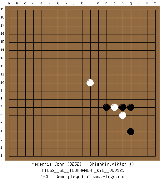 Last move : 1-0 2011 November 19 1:1:51 [Event "FICGS__GO__TOURNAMENT_KYU__000129"] [Site "FICGS"] [Date "2011.10.15"] [Round "1"] [Black "Medearis,John"] [White "Shishkin,Viktor"] [Result "1-0"] [Rating 1 "0252"] 1.q4 p6 2.q7 l10 3.n7 o7 4.p7 1-0 This go game has been lost on time (started : 2011.10.15 18:2:9) Here are the names of the openings (joseki) played in the four corners : Corner q4 : q4 p6 Hoshi (Hwajeom, Seongjeom, Xingwei`) 4-4 Point. The star or hoshi (4-4) point, emphasizing influence at the potential expense of territory. Player Black won this Go (weiqi, baduk) game. Follow this game move after move (download)Every move brings change. (Pierre Audouard) Secret operations are essential in war; upon them the army relies to make its every move. (Sun Tzu)