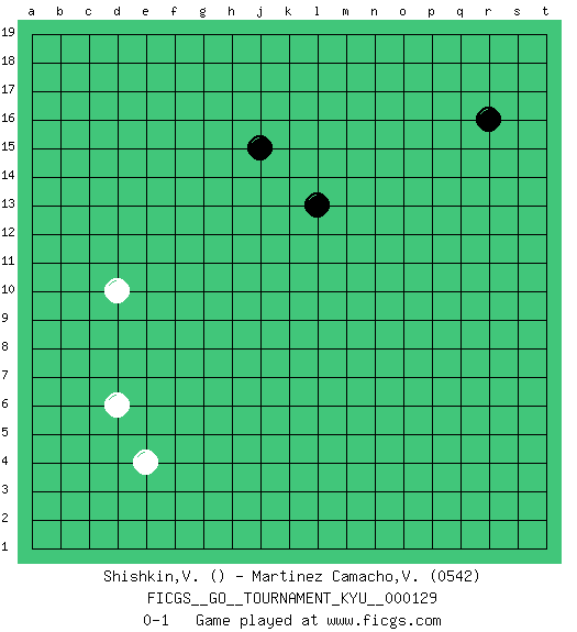Last move : 0-1 2011 November 19 1:1:51 [Event "FICGS__GO__TOURNAMENT_KYU__000129"] [Site "FICGS"] [Date "2011.10.15"] [Round "1"] [Black "Shishkin,Viktor"] [White "Martinez Camacho,Victor Hugo"] [Result "0-1"] [Rating 2 "0542"] 1.r16 e4 2.l13 d6 3.j15 d10 0-1 This go game has been lost on time (started : 2011.10.15 18:2:9) Here are the names of the openings (joseki) played in the four corners : Player White won this Go (weiqi, baduk) game. Follow this game move after move (download)Stop on second, extend on third. (Anonymous) Memory is a crazy woman that hoards colored rags and throws away food. (Austin O'Malley)