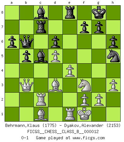 Last move : 0-1 2007 February 25 2:31:36 [Event "FICGS__CHESS__CLASS_B__000012"] [Site "FICGS"] [Date "2007.01.04"] [Round "1"] [White "Behrmann,Klaus"] [Black "Dyakov,Alexander"] [Result "0-1"] [WhiteElo "1775"] [BlackElo "2153"] 1.d4 Nf6 2.c4 e6 3.Nf3 b6 4.e3 Bb7 5.Be2 Be7 6.O-O c5 7.Nc3 cxd4 8.Qxd4 O-O 9.e4 Nc6 10.Qd3 Qc7 11.Bg5 a6 12.Rfd1 Rad8 13.a3 d6 14.Rac1 Ne5 15.Qd4 h6 16.Be3 Ned7 17.b4 Ng4 18.Bd2 Nc5 19.Nd5 exd5 20.cxd5 Bf6 21.Qc4 Bb2 22.Rc2 Bxa3 23.h3 Nf6 24.bxc5 Bxc5 25.Bd3 b5 26.Qb3 Rfe8 27.Re1 Qb6 28.Bc1 Rc8 29.Bb2 Nh5 30.Bc1 Rc7 31.Kf1 Bc8 0-1 Queen's Indian : 4.e3 Kingside Castling by player White (move 6) Kingside Castling by player Black (move 8) Player Black won this chess game. Follow this game move after move (download)Openings teach you openings. Endgames teach you chess ! (Stephan Gerzadowicz) Matt entspricht nicht immer den Tatsachen. (Savielly Grigorievitsch Tartakower) El tablero es el mundo, las piezas es el fenomeno del universo, las reglas del juego son lo que llamamos leyes de la naturaleza y el jugador del lado opuesto, se encuentra oculto a nuestra vista. (Thomas Huxley) Si rien de grave n'est détecté lors de l'analyse d'une position, on joue alors le coup. Seconde règle de Blumenfeld. Perfection is achieved, not when there is nothing more to add, but when there is nothing left to take away. (Antoine de Saint-Exupéry)