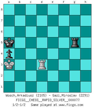 Last move : 1/2-1/2 2012 April 18 23:20:32 [Event "FICGS__CHESS__RAPID_SILVER__000077"] [Site "FICGS"] [Date "2011.10.15"] [Round "1"] [White "Wosch,Arkadiusz"] [Black "Gazi,Miroslav"] [Result "1/2-1/2"] [WhiteElo "2105"] [BlackElo "2291"] 1.e4 c5 2.Nf3 d6 3.d4 cxd4 4.Nxd4 Nf6 5.Nc3 a6 6.Be3 e5 7.Nb3 Be6 8.f3 h5 9.Qd2 Nbd7 10.O-O-O Be7 11.Kb1 b5 12.a3 O-O 13.h3 Nb6 14.Qf2 Nc4 15.Bxc4 bxc4 16.Nc5 Qc7 17.N5a4 Qc6 18.Bg5 Rab8 19.Qd2 Rfd8 20.Rhg1 Qb7 21.Ka1 Bd7 22.Bxf6 Bxf6 23.Qd5 Be7 24.Qxb7 Rxb7 25.Rb1 Bc6 26.Ka2 f5 27.Rgd1 fxe4 28.fxe4 Bg5 29.b4 cxb3+ 30.cxb3 Be3 31.Nd5 Bd4 32.Nac3 Rc8 33.Rbc1 Rcb8 34.Ne2 Bxd5 35.exd5 Rxb3 36.Nxd4 Rb2+ 37.Ka1 exd4 38.Rc8+ Rxc8 39.Kxb2 Rc5 40.Rxd4 g5 41.g4 h4 42.Ra4 a5 43.Rd4 Kf7 44.Rd3 Ke7 45.Re3+ Kf7 46.Rd3 Kf6 47.Rf3+ Ke5 48.Rf5+ Kd4 49.Rxg5 Rc3 50.Rg6 Rxh3 51.Rxd6 a4 52.g5 Rb3+ 53.Kc1 h3 54.Rd8 Rc3+ 55.Kd2 Rxa3 56.Rh8 Kxd5 57.g6 Rg3 58.g7 Rxg7 59.Rxh3 Rg2+ 60.Kc3 Rg4 61.Kb2 Kc4 62.Ka3 Kb5 63.Re3 Rg5 64.Rf3 Ka5 65.Rd3 1/2-1/2 Sicilian : Najdorf, Byrne (English) attack Queenside Castling by player White (move 10) Kingside Castling by player Black (move 12) 10 pieces endgame at move 50 : White KRPPP , Black KRPPP WHITE : King + 1 Rook 3 Pawns BLACK : King + 1 Rook 3 Pawns 9 pieces endgame at move 51 : White KRPPP , Black KRPP WHITE : King + 1 Rook 3 Pawns BLACK : King + 1 Rook 2 Pawns 8 pieces endgame at move 55 : White KRPP , Black KRPP WHITE : King + 1 Rook 2 Pawns BLACK : King + 1 Rook 2 Pawns 7 pieces endgame at move 56 : White KRP , Black KRPP WHITE : King + 1 Rook 1 Pawn BLACK : King + 1 Rook 2 Pawns 6 pieces endgame at move 58 : White KR , Black KRPP WHITE : King + 1 Rook BLACK : King + 1 Rook 2 Pawns 5 pieces endgame at move 59 : White KR , Black KRP WHITE : King + 1 Rook BLACK : King + 1 Rook 1 Pawn This chess game ended in a draw. Follow this game move after move (download)The winner of the game is the player who makes the next-to-last mistake. (Savielly Tartakover) Mit sehr nachdenklichem Gesicht schreitet Bobby durch den Turniersaal. Was ist passiert?, fragt Lombardy. Ich stehe schlecht, antwortet Fischer. Lombardy: Dann biete doch einfach Remis an. Fischer: So schlecht stehe ich nun auch wieder nicht! (Robert James Fischer) Con el tiempo, empecé a progresar en partidas decisivas. Tal vez porque me di cuenta de una simple verdad: no solo estaba yo nervioso sino también mi oponente. (Mikhail Tal) Les Cavaliers se révèlent fort utiles dans les positions fermées. D'habitude, les Fous sont un peu plus forts que les Cavaliers dans les positions ouvertes. Qu'on le veuille ou non, il restera toujours des exceptions ! For a mechanic, you seem to do an excessive amount of thinking. (C-3PO in Star Wars ep.2)