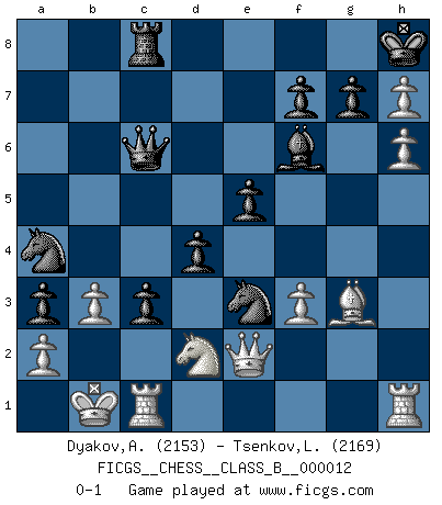 Last move : 0-1 2007 June 11 7:19:48 [Event "FICGS__CHESS__CLASS_B__000012"] [Site "FICGS"] [Date "2007.01.04"] [Round "1"] [White "Dyakov,Alexander"] [Black "Tsenkov,Ljubomir"] [Result "0-1"] [WhiteElo "2153"] [BlackElo "2169"] 1.e4 c5 2.Nf3 d6 3.d4 cxd4 4.Nxd4 Nf6 5.Nc3 a6 6.Be3 e5 7.Nb3 Be6 8.f3 Be7 9.Qd2 O-O 10.O-O-O b5 11.g4 b4 12.Nd5 Bxd5 13.exd5 a5 14.g5 Nfd7 15.Kb1 Qc7 16.h4 Nb6 17.h5 N8d7 18.Qd3 a4 19.Nd2 Ra5 20.Qf5 Rxd5 21.Bd3 Rxd3 22.Qxd3 d5 23.g6 d4 24.Bf2 Nd5 25.gxh7+ Kh8 26.Qc4 Qb7 27.Rde1 Rc8 28.Qd3 Qc6 29.Bg3 Ne3 30.Rc1 a3 31.b3 Nc5 32.h6 Bf6 33.Qe2 Na4 34.c4 bxc3 0-1 Sicilian : Najdorf, Byrne (English) attack Kingside Castling by player Black (move 9) Queenside Castling by player White (move 10) Player Black won this chess game. Follow this game move after move (download)Live, lose, and learn, by observing your opponent how to win. (Amber Steenbock) Alle offensichtlichen Züge sehen nach dem Spiel in der Analyse verdächtig aus. (Viktor Kortschnoi) Combinaciones deslumbrantes son para la mayoría, mover madera es para los pocos. (Georg Kieninger) On a dit que l'homme se distingue de l'animal par le fait qu'il achète plus de livres qu'il ne peut en lire. Je voudrais suggérer qu'inclure à la liste des livres quelques livres d'échecs rendrait la distinction manifeste. (Edward Lasker) It's not the size of the dog in the fight, it's the size of the fight in the dog. (Mark Twain)