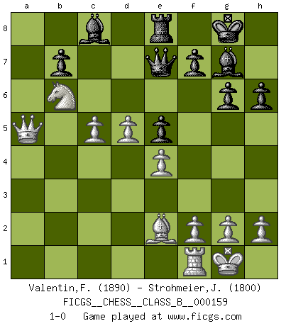 Last move : 1-0 2012 February 5 17:58:27 [Event "FICGS__CHESS__CLASS_B__000159"] [Site "FICGS"] [Date "2011.10.16"] [Round "1"] [White "Valentin,Florea"] [Black "Strohmeier,Josef"] [Result "1-0"] [WhiteElo "1890"] [BlackElo "1800"] 1.d4 Nf6 2.c4 g6 3.Nc3 Bg7 4.e4 d6 5.Nf3 O-O 6.Be2 e5 7.d5 Nbd7 8.Be3 Ng4 9.Bg5 Ngf6 10.O-O h6 11.Be3 a5 12.Nd2 Ne8 13.a3 Nc5 14.b4 axb4 15.axb4 Rxa1 16.Qxa1 Nd7 17.Qa8 Nef6 18.Nb5 Re8 19.Qa5 Nb6 20.Nxc7 Qxc7 21.Bxb6 Qe7 22.c5 Nd7 23.Nc4 Nxb6 24.Nxb6 dxc5 25.bxc5 1-0 King's Indian : Petrosian system, Main line Kingside Castling by player Black (move 5) Kingside Castling by player White (move 10) Player White won this chess game. Follow this game move after move (download)Fischer was a master of clarity and a king of artful positioning. His opponents would see where he was going but were powerless to stop him. (Bruce Pandolfini) Frage des Reporters: -Welche besonderen Umstände rechtfertigen das Anhalten der Uhren während einer Turnierpartie? Antwort: -Einen Fotographen zu strangulieren. (Siegbert Tarrasch) Los Peones son nacidos libres, y aún así, se encuentran por doquier encadenados. (Rick Kennedy) Aux échecs, l'amour-propre est satisfait quand on remporte la victoire, mais il n'y a pas de honte à être battu. (Benjamin Franklin) Tree pose grows confidence. It roots me to this world. (Terri Guillemets)