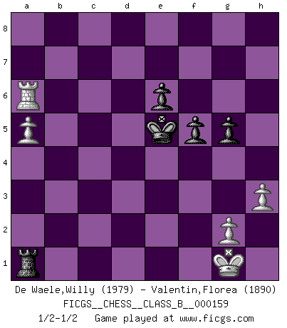 Last move : 1/2-1/2 2012 January 12 18:45:44 [Event "FICGS__CHESS__CLASS_B__000159"] [Site "FICGS"] [Date "2011.10.16"] [Round "1"] [White "De Waele,Willy"] [Black "Valentin,Florea"] [Result "1/2-1/2"] [WhiteElo "1979"] [BlackElo "1890"] 1.e4 c5 2.Nf3 e6 3.d4 cxd4 4.Nxd4 Nc6 5.Nc3 Qc7 6.Be3 a6 7.Bd3 Nf6 8.O-O b5 9.Nxc6 Qxc6 10.a3 Bb7 11.Qe2 Rc8 12.f4 Bc5 13.Kh1 Bxe3 14.Qxe3 d5 15.exd5 Nxd5 16.Nxd5 Qxd5 17.Rf2 O-O 18.Rd2 Qc5 19.Qxc5 Rxc5 20.Be2 g5 21.Rf1 h6 22.fxg5 hxg5 23.Kg1 Rd5 24.Rxd5 Bxd5 25.b3 Rc8 26.c4 bxc4 27.bxc4 Be4 28.Rd1 Rb8 29.Rd6 a5 30.Bd3 Bxd3 31.Rxd3 Rb1+ 32.Kf2 Rc1 33.Rd8+ Kg7 34.Ra8 Rxc4 35.Rxa5 f5 36.h3 Kf6 37.a4 Rc2+ 38.Kf1 Ra2 39.Kg1 Ra3 40.Ra8 Ke5 41.Ra6 Ra2 42.a5 Ra1+ 1/2-1/2 Sicilian : Taimanov variation Kingside Castling by player White (move 8) Kingside Castling by player Black (move 17) 10 pieces endgame at move 35 : White KRPPP , Black KRPPP WHITE : King + 1 Rook 3 Pawns BLACK : King + 1 Rook 3 Pawns This chess game ended in a draw. Follow this game move after move (download)Alekhine is a poet who creates a work of art out of something that would hardly inspire another man to send home a picture post card. (Max Euwe) Bobby Fischer ist kein Vorbild für die heutige Jugend. (Viktor Kortschnoi) El Ajedrez, como la música, como el amor, tiene el poder de hacer feliz a la gente. (Siegbert Tarrasch) La tactique est l'élément le plus important du milieu de jeu. (Siegbert Tarrasch) Ah, beer! The cause of, and the solution to, all of life's problems. (Homer Simpson)