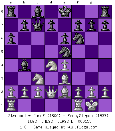 Last move : 1-0 2011 December 16 4:35:14 [Event "FICGS__CHESS__CLASS_B__000159"] [Site "FICGS"] [Date "2011.10.16"] [Round "1"] [White "Strohmeier,Josef"] [Black "Pech,Stepan"] [Result "1-0"] [WhiteElo "1800"] [BlackElo "1939"] 1.e4 c5 2.Nf3 e6 3.d4 cxd4 4.Nxd4 a6 5.Nc3 Qc7 6.Be2 Nc6 7.O-O Nf6 8.Be3 Bb4 9.Qd3 Ne5 10.Qd2 1-0 This chess game has been lost on time (started : 2011.10.16 17:33:48) Sicilian : Kan, 5.Nc3 Kingside Castling by player White (move 7) Player White won this chess game. Follow this game move after move (download)In a gambit you give up a Pawn for the sake of getting a lost game. (Samuel Standige Boden) Sehr viele beherrschen heutzutage das große Einmalseins des Schachspiels und kennen sogar dessen Logarithmentafeln auswendig - deshalb sollte man hin und wieder zu beweisen trachten, dass zwei mal zwei auch fünf sein kann. (Mikhail Nekhemyevich Tal) Coloca el contenido del tablero de Ajedrez en un sombrero, agita las piezas vigorosamente, derrámalas en el tablero desde una altura de medio metro y así obtienes el estilo de Wilhelm Steinitz. (H. E. Bird) Les échecs c'est le défi de l'alpiniste, toujours plus haut, prêt à tout pour monter à l'assaut du Roi ennemi. Les échecs, c'est de la musique en mouvement, un ballet majestueux pour les yeux. C'est de la poésie composée par les fantômes du passé qui au même titre que Rimbaud ou Verlaine méritent notre admiration. Les échecs, c'est de la peinture ou le moindre mouvement modifie le tableau pour en faire un Picasso ou un Van Gogh. Les échecs, c'est tout et rien, c'est la vie et la mort. Jjulie33 sur le forum de France-Echecs. Computer Science is no more about computers than astronomy is about telescopes. (Edsger W. Dijkstra)