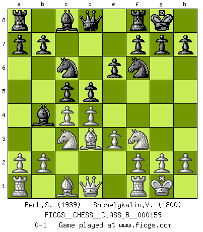 Last move : 0-1 2011 December 14 16:25:36 [Event "FICGS__CHESS__CLASS_B__000159"] [Site "FICGS"] [Date "2011.10.16"] [Round "1"] [White "Pech,Stepan"] [Black "Shchelykalin,Vyacheslav"] [Result "0-1"] [WhiteElo "1939"] [BlackElo "1800"] 1.d4 Nf6 2.c4 e6 3.Nc3 Bb4 4.e3 O-O 5.Bd3 d5 6.Nf3 c5 7.O-O Nc6 0-1 This chess game has been lost on time (started : 2011.10.16 17:33:48) Nimzo-Indian : 4.e3 O-O, 5.Bd3 d5 Kingside Castling by player Black (move 4) Kingside Castling by player White (move 7) Player Black won this chess game. Follow this game move after move (download)You need not play well - just help your opponent to play badly. (Genrikh Chepukaitis) Ich hatte meine größten Erfolge, als ich 47 Jahre alt war. Kasparow war noch nicht mal 42 und hat das Schach schon im Stich gelassen. (Viktor Kortschnoi) Los asuntos humanos son como una partida de Ajedrez: solo aquellos que no lo toman seriamente, pueden ser llamados buenos jugadores. (Hung Tzu Ch'eng) Ce qui caractérise les parties de combat, c'est que si le défenseur a constamment de difficiles problèmes à résoudre, l'attaquant doit chercher sans relâche de nouvelles possibilités d'attaque. (Koblentz) Once you start thinking you have nothing left to learn, you have everything to learn. (Steve Badget)