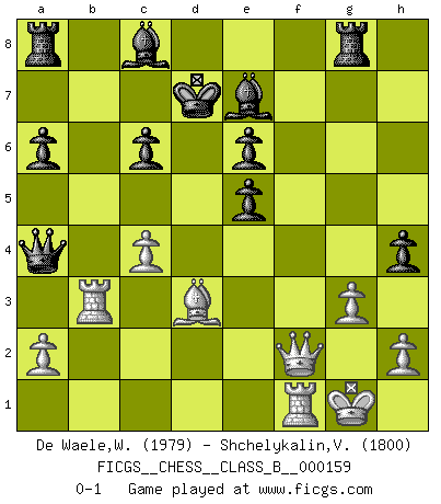 Last move : 0-1 2011 November 5 20:32:7 [Event "FICGS__CHESS__CLASS_B__000159"] [Site "FICGS"] [Date "2011.10.16"] [Round "1"] [White "De Waele,Willy"] [Black "Shchelykalin,Vyacheslav"] [Result "0-1"] [WhiteElo "1979"] [BlackElo "1800"] 1.e4 c5 2.Nf3 d6 3.d4 cxd4 4.Nxd4 Nf6 5.Nc3 a6 6.Bg5 e6 7.f4 Qb6 8.Qd2 Qxb2 9.Rb1 Qa3 10.f5 Nc6 11.fxe6 fxe6 12.Nxc6 bxc6 13.e5 dxe5 14.Bxf6 gxf6 15.Ne4 Be7 16.Be2 h5 17.Rb3 Qa4 18.Nxf6+ Bxf6 19.c4 Bh4+ 20.g3 Be7 21.O-O h4 22.Bd3 Rg8 23.Qf2 Kd7 0-1 Sicilian : Najdorf, 7...Qb6 Kingside Castling by player White (move 21) Player Black won this chess game. Follow this game move after move (download)I have always a slight feeling of pity for the man who has no knowledge of Chess. (Siegbert Tarrasch) Herr Iljumschinow ist ein etwas merkwürdiger Geschäftsmann: Er arbeitet zusammen mit Leuten wie Muammar al-Gaddafi; früher ist das Saddam Hussein gewesen. (Joel Lautier) Botvinnik trató de alejar el misterio referente al Ajedrez, siempre relacionandolo a situaciones de la vida diaria. Solía llamar al Ajedrez un problema inexacto típico, similar a aquellos en que la gente tiene siempre que resolver a cada día. (Garry Kasparov) Je ne crois pas en la psychologie, je crois aux bons coups. (Robert Fischer) I just play for fun. (Anna Kournikova)