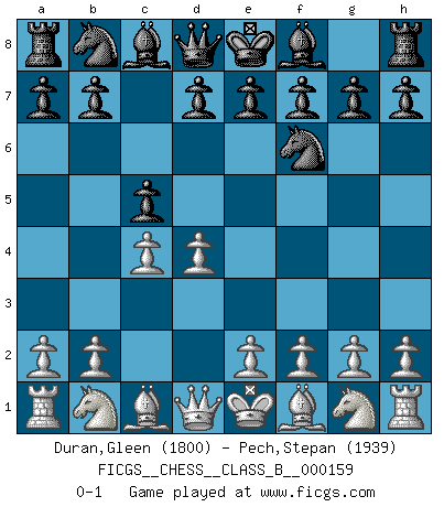 Last move : 0-1 2011 November 30 2:30:56 [Event "FICGS__CHESS__CLASS_B__000159"] [Site "FICGS"] [Date "2011.10.16"] [Round "1"] [White "Duran,Gleen"] [Black "Pech,Stepan"] [Result "0-1"] [WhiteElo "1800"] [BlackElo "1939"] 1.d4 Nf6 2.c4 c5 0-1 This chess game has been lost on time (started : 2011.10.16 17:33:48) Benoni defense Player Black won this chess game. Follow this game move after move (download)Later, I began to succeed in decisive games. Perhaps because I realized a very simple truth: not only was I worried, but also my opponent. (Mikhail Tal) Im Spitzenschach von heute geht es nur um Vorbereitung, um tiefgründige, sorgfältige Eröffnungsvorbereitung. (Nigel Short) Los Peones son nacidos libres, y aún así, se encuentran por doquier encadenados. (Rick Kennedy) Si rien de grave n'est détecté lors de l'analyse d'une position, on joue alors le coup. Seconde règle de Blumenfeld. Unless I accept my faults I will most certainly doubt my virtues. (Hugh Prather)
