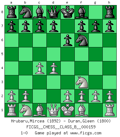 Last move : 1-0 2011 November 28 2:12:32 [Event "FICGS__CHESS__CLASS_B__000159"] [Site "FICGS"] [Date "2011.10.16"] [Round "1"] [White "Hrubaru,Mircea"] [Black "Duran,Gleen"] [Result "1-0"] [WhiteElo "1892"] [BlackElo "1800"] 1.d4 Nf6 2.c4 e6 3.Nf3 1-0 This chess game has been lost on time (started : 2011.10.16 17:33:48) Queen's pawn game Player White won this chess game. Follow this game move after move (download)Methodical thinking is of more use in Chess than inspiration. (C. J. S. Purdy) Schach wird sich dank seiner hohen kulturellen Tradition immer durchsetzen. In näherer Zukunft womöglich sogar als Gegenreaktion auf die maßlose Reizüberflutung im Freizeit- und Spielbereich. (Garry Kasparov) Solo puedes ser bueno en el Ajedrez si amas al juego. (Bobby Fischer) On croit qu'il y a plus de mauvais joueurs que de bons joueurs, c'est faux : Il y a autant de joueurs qui gagnent que de joueurs qui perdent. (Philippe Geluck) The weakness of an artist is dogma. (Josh Waitzkin)