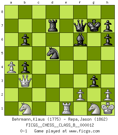 Last move : 0-1 2007 February 24 16:7:21 [Event "FICGS__CHESS__CLASS_B__000012"] [Site "FICGS"] [Date "2007.01.04"] [Round "1"] [White "Behrmann,Klaus"] [Black "Repa,Jason"] [Result "0-1"] [WhiteElo "1775"] [BlackElo "1862"] 1.d4 e6 2.e4 d5 3.e5 c5 4.c3 Qb6 5.Nf3 Nc6 6.a3 a5 7.Be2 Nh6 8.b3 Bd7 9.Bxh6 gxh6 10.O-O Bg7 11.Re1 O-O 12.Bd3 f6 13.exf6 Bxf6 14.dxc5 Qxc5 15.Qd2 e5 16.b4 Qd6 17.Be4 Ne7 18.c4 axb4 19.cxd5 Bf5 20.a4 Bg7 21.Qd1 Bxe4 22.Rxe4 Nxd5 23.Ra2 Rad8 24.Rd2 Rf4 25.Rxf4 exf4 26.Rd3 Qe6 27.Qb3 Bf6 28.Rd1 Qf7 29.Re1 b6 30.Kh1 Kg7 31.Ng1 Rd7 32.g3 fxg3 0-1 Queen's pawn Kingside Castling by player White (move 10) Kingside Castling by player Black (move 11) Player Black won this chess game. Follow this game move after move (download)Chess mastery essentially consists of analyzing Chess positions accurately. (Mikhail Botvinnik) Ich habe die besten Aussichten, den ersten Preis zu gewinnen - denn jeder muss gegen Steinitz spielen, nur ich nicht! (Wilhelm Steinitz) El estómago es una parte esencial del maestro de Ajedrez. (Bent Larsen) L'attaque fait le spectacle, la défense gagne les matchs. (Dicton footballistique) Gambling : The sure way of getting nothing from something. (Wilson Mizner)