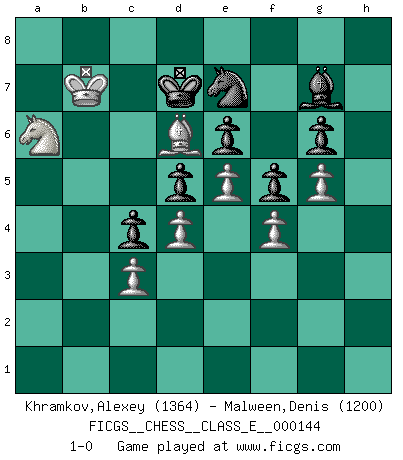 Last move : 1-0 2012 April 26 10:51:34 [Event "FICGS__CHESS__CLASS_E__000144"] [Site "FICGS"] [Date "2011.10.17"] [Round "1"] [White "Khramkov,Alexey"] [Black "Malween,Denis"] [Result "1-0"] [WhiteElo "1364"] [BlackElo "1200"] 1.e4 c5 2.Nc3 Nc6 3.f4 d6 4.Nf3 g6 5.Nd5 e6 6.Ne3 Bg7 7.c3 Nge7 8.Be2 O-O 9.O-O a6 10.a4 b6 11.d4 Bb7 12.e5 d5 13.g4 f5 14.g5 Rf7 15.h4 Rc8 16.Kf2 c4 17.Rh1 Kf8 18.h5 Ke8 19.hxg6 hxg6 20.Rh7 b5 21.axb5 axb5 22.b3 Kd7 23.bxc4 bxc4 24.Ba3 Ra8 25.Bc5 Rxa1 26.Qxa1 Qa8 27.Qb2 Bc8 28.Nc2 Qb7 29.Qxb7 Bxb7 30.Nb4 Ke8 31.Nxc6 Bxc6 32.Bd1 Bf8 33.Rh8 Rg7 34.Nh4 Kf7 35.Ke3 Bb5 36.Kd2 Bd7 37.Kc1 Be8 38.Kb2 Rg8 39.Rxg8 Kxg8 40.Ka3 Kf7 41.Ba4 Bxa4 42.Kxa4 Kg7 43.Kb5 Kf7 44.Ka6 Ke8 45.Nf3 Kd7 46.Kb7 Kd8 47.Ne1 Kd7 48.Nc2 Kd8 49.Nb4 Kd7 50.Bd6 Bg7 51.Na6 1-0 Sicilian : Grand Prix attack Kingside Castling by player Black (move 8) Kingside Castling by player White (move 9) Player White won this chess game. Follow this game move after move (download)You must take your opponent into a deep dark forest where 2+2=5, and the path leading out is only wide enough for one. (Mikhail Tal) Das Schach hält seine Meister in eigenen Banden, Fesseln; auf vielerlei Weise formt es ihren Geist, so dass die innere Freiheit selbst des Stärksten beeinflusst wird. (Albert Einstein) Si pudieramos observar el interior de la cabeza de un jugador de Ajedrez, encontraríamos ahí un mundo lleno de sentimientos, imágenes, ideas, emoción y pasión. (Alfred Binet) Pour moi, les échecs ne sont pas un jeu mais un art. (Alexandre Alekhine) Wisdom doesn't necessarily come with age. Sometimes age just shows up all by itself. (Tom Wilson)