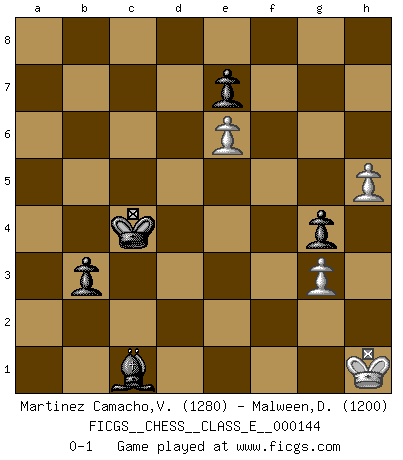 Last move : 0-1 2012 April 12 19:26:13 [Event "FICGS__CHESS__CLASS_E__000144"] [Site "FICGS"] [Date "2011.10.17"] [Round "1"] [White "Martinez Camacho,Victor Hugo"] [Black "Malween,Denis"] [Result "0-1"] [WhiteElo "1280"] [BlackElo "1200"] 1.e4 c5 2.f4 Nc6 3.Nc3 g6 4.Bc4 Bg7 5.Nf3 d6 6.O-O Nf6 7.Ng5 O-O 8.d3 h6 9.Nxf7 Rxf7 10.Bxf7+ Kxf7 11.Nd5 Bg4 12.Qe1 Nd4 13.Nxf6 Bxf6 14.c3 Nc6 15.Be3 Kg7 16.Qg3 Be6 17.f5 Bf7 18.fxg6 Bxg6 19.Qh3 h5 20.Rf2 Qc8 21.Qg3 Qg4 22.Qxg4 hxg4 23.Rb1 b5 24.Rc2 a5 25.a3 Ne5 26.Rd1 Rb8 27.b4 axb4 28.axb4 Rc8 29.bxc5 dxc5 30.Rb2 Be8 31.d4 Nc4 32.Re2 Nxe3 33.Rxe3 cxd4 34.cxd4 Rc4 35.e5 Bg5 36.Rg3 Bh5 37.d5 Bf4 38.Rb3 b4 39.e6 Kf6 40.Rdb1 Bd6 41.Rf1+ Ke5 42.Rd1 Rd4 43.Re1+ Kxd5 44.g3 Bg6 45.Kf2 Rd2+ 46.Kg1 Bc5+ 47.Kh1 Be4+ 48.Rxe4 Kxe4 49.h4 Kd4 50.h5 Kc4 51.Rb1 b3 52.Rc1+ Rc2 53.Rf1 Be3 54.Rb1 Rc1+ 55.Rxc1+ Bxc1 0-1 Sicilian : Grand Prix attack Kingside Castling by player White (move 6) Kingside Castling by player Black (move 7) 10 pieces endgame at move 55 : White KRPPP , Black KBPPP WHITE : King + 1 Rook 3 Pawns BLACK : King + 1 Bishop 3 Pawns 9 pieces endgame at move 55 : White KPPP , Black KBPPP WHITE : King + 3 Pawns BLACK : King + 1 Bishop 3 Pawns Player Black won this chess game. Follow this game move after move (download)It is always better to sacrifice your opponent's men. (Savielly Tartakower) Ich war zu klein für die Schach-Schülermannschaft! (Woody Allen) Debemos de asegurarnos de que el Ajedrez no se convierta en un lenguaje muerto, muy interesante, pero solo para un grupo muy pequeño. (Sytze Faber) Vous savez, camarade Pachman, je n'éprouve pas de plaisir à être ministre, je jouerais plutôt aux échecs comme vous, ou alors ferais une révolution au Venezuela. (Che Guevara à Ludek Pachman, 'Checkmate in Prague', 1975) The Internet isn't free. It just has an economy that makes no sense to capitalism. (Brad Shapcott)