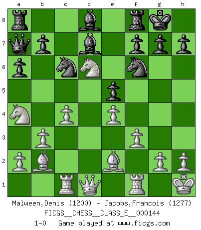 Last move : 1-0 2011 December 17 18:4:2 [Event "FICGS__CHESS__CLASS_E__000144"] [Site "FICGS"] [Date "2011.10.17"] [Round "1"] [White "Malween,Denis"] [Black "Jacobs,Francois"] [Result "1-0"] [WhiteElo "1200"] [BlackElo "1277"] 1.e4 c5 2.Nf3 e6 3.d4 cxd4 4.Nxd4 Nf6 5.f3 Be7 6.c4 a6 7.Nc3 Qc7 8.b3 O-O 9.Bb2 d6 10.Rc1 Bd7 11.Be2 Nc6 12.O-O Qb6 13.Na4 Qa7 14.Kh1 e5 15.Nf5 Bd8 16.Nxd6 1-0 Sicilian : Anderssen variation Kingside Castling by player Black (move 8) Kingside Castling by player White (move 12) Player White won this chess game. Follow this game move after move (download)The Pawns are the soul of the game. (Francois Andre Danican Philidor) Ohne Fehler kann es keine Brillanz geben. (Emanuel Lasker) Las leyes del Ajedrez no permiten una libre elección: tienes que mover quieras o no. (Emanuel Lasker) Je ne crois pas en la psychologie, je crois aux bons coups. (Robert Fischer) He who defends everything defends nothing. (Frederick the Great)