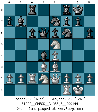 Last move : 0-1 2011 October 25 11:9:6 [Event "FICGS__CHESS__CLASS_E__000144"] [Site "FICGS"] [Date "2011.10.17"] [Round "1"] [White "Jacobs,Francois"] [Black "Stoyanov,Zdravko"] [Result "0-1"] [WhiteElo "1277"] [BlackElo "1261"] 1.d4 d5 2.c4 dxc4 3.e4 c6 4.Bxc4 e6 5.Nf3 h6 6.O-O Ne7 7.Nc3 Ng6 8.Be3 Bb4 9.Qc2 Nd7 10.Rad1 Ne7 11.Ne2 O-O 12.Nf4 Qc7 13.Nd3 Ba5 14.Rc1 Nf6 15.Nde5 b5 16.Bxb5 Bb7 17.Bd3 Rac8 18.Qe2 Bb6 19.Rc2 Qd6 20.Nd2 Bxd4 0-1 QGA : 3.e4 Kingside Castling by player White (move 6) Kingside Castling by player Black (move 11) Player Black won this chess game. Follow this game move after move (download)The chessboard is the world, the pieces are the phenomena of the Universe, the rules of the game are what we call the laws of Nature and the player on the other side is hidden from us. (Thomas Huxley) Es ist schade, dass viele Schachsportler vergessen, wie wichtig Auftreten und angemessene Kleidung sind. (Alexandra Kosteniuk) El sobresalir en el Ajedrez es un signo de una mente intrigante. (Sir Arthur Conan Doyle) Le joueur d'Echecs qui veut atteindre le top est obligé de développer son propre credo créatif. Alexeï Stepanovicth Souétine. Il est facile d'écrire des livres ! Ce qui est difficile, c'est de jouer ! (Alexeï Stepanovicth Souétine) Who needs drugs and alcohol if he can play Big Chess at FICGS ? (Heinz-Georg Lehnhoff)
