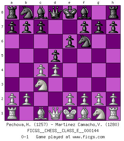 Last move : 0-1 2011 December 1 14:51:11 [Event "FICGS__CHESS__CLASS_E__000144"] [Site "FICGS"] [Date "2011.10.17"] [Round "1"] [White "Pechova,Hana"] [Black "Martinez Camacho,Victor Hugo"] [Result "0-1"] [WhiteElo "1257"] [BlackElo "1280"] 1.d4 Nf6 2.c4 d5 3.Nc3 e6 0-1 This chess game has been lost on time (started : 2011.10.17 16:37:14) Queen's pawn game Player Black won this chess game. Follow this game move after move (download)I am still a victim of Chess. It has all the beauty of art and much more. It cannot be commercialized. Chess is much purer than art in its social position. (Marcel Duchamp) Ich verstehe den Grund nicht, warum die Aufteilung in Frauen und Männer überhaupt im Schach besteht. (Judith Polgar) Cuando no sepas que mover, espera por una idea que se le venga a la la cabeza de tu oponente. Tenlo por seguro de que esa idea estará incorrecta. (Siegbert Tarrasch) Mon pion favori sur ma case favorite ! Bronstein en parlant d'un coup de pion en h5 quand il avait les Noirs. I'm extremely disappointed. I send you out for exciting, new designer drugs, you come back with tomato sauce. (Gregory House, House M.D.)
