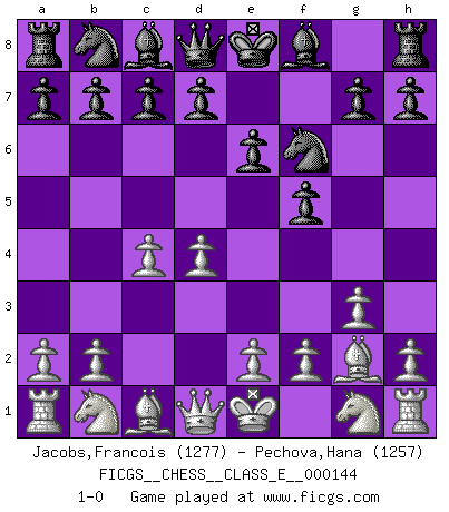 Last move : 1-0 2011 November 28 2:12:32 [Event "FICGS__CHESS__CLASS_E__000144"] [Site "FICGS"] [Date "2011.10.17"] [Round "1"] [White "Jacobs,Francois"] [Black "Pechova,Hana"] [Result "1-0"] [WhiteElo "1277"] [BlackElo "1257"] 1.d4 f5 2.g3 Nf6 3.Bg2 e6 4.c4 1-0 This chess game has been lost on time (started : 2011.10.17 16:37:14) Dutch defense Player White won this chess game. Follow this game move after move (download)Fischer Chess play was always razor-sharp, rational and brilliant. One of the best ever. (Dave Regis) Ich las kürzlich ein Buch von Nietzsche. Er sagte Religion verdumme nur die Menschen. Ich stimme zu. (Robert James Fischer) Un mal plan es mejor que no tener ningún plan. (Frank Marshall) La guerre est enfant de la passion, la passion est enfant du narcissisme et le narcissisme est l'enfant. (...) Une autre partie ? (Thibault de Vassal) The project of the man are lower than those of the sky. (Chinese proverb)