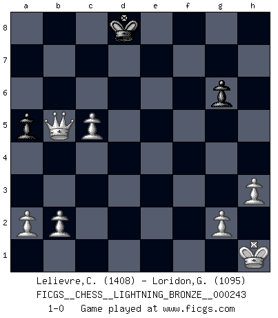 Last move : 1-0 2011 October 17 21:17:12 [Event "FICGS__CHESS__LIGHTNING_BRONZE__000243"] [Site "FICGS"] [Date "2011.10.17"] [Round "1"] [White "Lelievre,Clement"] [Black "Loridon,Geoffroy"] [Result "1-0"] [WhiteElo "1408"] [BlackElo "1095"] 1.e4 e5 2.Nf3 Nc6 3.Bb5 Bc5 4.Bxc6 dxc6 5.Nxe5 f6 6.Nf3 Nh6 7.d4 Bb4+ 8.Nc3 Bg4 9.O-O Bxf3 10.Qxf3 Qxd4 11.Be3 Qe5 12.Bf4 Qc5 13.Bxc7 Rc8 14.Bf4 O-O 15.Rfd1 f5 16.Bd6 Rfd8 17.Bxc5 Bxc5 18.Rxd8+ Rxd8 19.exf5 Rf8 20.Nd5 Rxf5 21.Qb3 cxd5 22.Qb5 Bxf2+ 23.Kh1 b6 24.Rf1 Ng4 25.h3 a6 26.Qe8+ Rf8 27.Qe6+ Rf7 28.Qxg4 a5 29.Qe6 Kf8 30.Qxd5 Ke7 31.Qe4+ Kf8 32.Qxh7 Bg3 33.Qh8+ Ke7 34.Rxf7+ Kxf7 35.Qh5+ Ke7 36.Qg5+ Kd7 37.Qxg3 b5 38.Qd3+ Ke7 39.Qxb5 g6 40.c4 Kd8 41.c5 1-0 Ruy Lopez : Classical (Cordel) defense Kingside Castling by player White (move 9) Kingside Castling by player Black (move 14) 10 pieces endgame at move 39 : White KQPPPPP , Black KPP WHITE : King + 1 Queen 5 Pawns BLACK : King + 2 Pawns Player White won this chess game. Follow this game move after move (download)If one piece is badly posted, the whole game is bad. (Tarrasch) Früher wurde jeder komplizierte Zug, jedes interessante Opfer mit großem Beifall und Enthusiasmus aufgenommen. Heute schaltet man einfach seinen Fritz an, und man kann sehen, was los ist, ob der Zug geht oder nicht. (Vladimir Kramnik) Las leyes del Ajedrez no permiten una libre elección: tienes que mover quieras o no. (Emanuel Lasker) C'est la seule position que je connaisse où les deux camps sont mals. Propos prêtés à V. Anand. Begin at the beginning and go on till you come to the end; then stop. (Lewis Carrol, Alice in Wonderland)