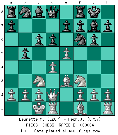 Last move : 1-0 2011 November 27 2:13:33 [Event "FICGS__CHESS__RAPID_E__000064"] [Site "FICGS"] [Date "2011.10.19"] [Round "1"] [White "Leurette,Marc-Antoine"] [Black "Pech,Jaroslav"] [Result "1-0"] [WhiteElo "1267"] [BlackElo "0737"] 1.e4 d6 2.d4 Nf6 3.Nc3 g6 4.Be3 Bg7 5.Nf3 O-O 6.Qd2 c6 7.O-O-O b5 8.e5 1-0 This chess game has been lost on time (started : 2011.10.19 10:43:14) Pirc defense Kingside Castling by player Black (move 5) Queenside Castling by player White (move 7) Player White won this chess game. Follow this game move after move (download)What is the difference between chess and football? Everybody understands football, but nobody plays it. Everybody plays chess, but nobody understands it. Everything is relative. (Vladimir Kramnik) Ohne ihre Erfolge schmälern zu wollen würde ich sagen Petrosian, Spassky und Karpov verdanken ihre Siege ihren Trainern - Boleslavsky, Bondarevsky und Furman. (Mikhail Moiseyevich Botvinik) El ganador de una partida es aquel jugador que hace el penúltimo error. (Savielly Tartakover) Aucun coup ne doit être joué sans but. (Pedro Damiano) Experience is the name we all give to our mistakes. (Oscar Wilde)