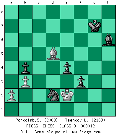 Last move : 0-1 2007 September 6 13:38:8 [Event "FICGS__CHESS__CLASS_B__000012"] [Site "FICGS"] [Date "2007.01.04"] [Round "1"] [White "Porkolab,Sandor"] [Black "Tsenkov,Ljubomir"] [Result "0-1"] [WhiteElo "2000"] [BlackElo "2169"] 1.e4 c5 2.Nf3 d6 3.d4 cxd4 4.Nxd4 Nf6 5.Nc3 a6 6.Bg5 e6 7.f4 b5 8.e5 dxe5 9.fxe5 Qc7 10.exf6 Qe5+ 11.Be2 Qxg5 12.O-O Qe5 13.Bh5 g6 14.Bf3 Ra7 15.Ne4 Bb7 16.Qd3 Bxe4 17.Bxe4 Bc5 18.c3 Rd7 19.Rad1 Qg5 20.Qe2 O-O 21.Kh1 Rfd8 22.Qc2 e5 23.Nf3 Rxd1 24.Rxd1 Rxd1+ 25.Qxd1 Qxf6 26.Qd5 Bd6 27.Qb7 Kf8 28.Bd5 Qe7 29.Qxe7+ Kxe7 30.Ng5 f5 31.Nxh7 Nd7 32.g4 e4 33.gxf5 gxf5 34.Bb7 a5 35.Bc8 b4 36.cxb4 axb4 37.Kg2 Be5 38.b3 Kd8 39.Ba6 Bf4 40.Bb5 Ke7 41.Bc4 Ne5 42.h4 Nf3 43.h5 Nd2 44.Bd5 Bh6 45.Kf2 f4 46.Bc6 Kf7 47.Bd5+ Kg7 48.Ng5 Bxg5 49.h6+ Bxh6 50.Ke2 f3+ 0-1 Sicilian : Najdorf, Polugayevsky variation Kingside Castling by player White (move 12) Kingside Castling by player Black (move 20) 10 pieces endgame at move 49 : White KBPP , Black KBNPPP WHITE : King + 1 Bishop 2 Pawns BLACK : King + 1 Bishop 1 Knight 3 Pawns Player Black won this chess game. Follow this game move after move (download)I love all positions. Give me a difficult positional game, I will play it. But totally won positions, I cannot stand them. (Hein Donner) Es ist schade, dass viele Schachsportler vergessen, wie wichtig Auftreten und angemessene Kleidung sind. (Alexandra Kosteniuk) Tu eres para mi la Reina en d8 y yo soy el Peón en d7!!. (GM Eduard Gufeld) Le temps de noter son nom sur la feuille de partie, j'étais déjà en zeitnot ! D'un modeste amateur apparié lors de la première ronde d'un open contre le grand-maître Azmaïparashvili. Computers have lots of memory but no imagination. (Anonymous)