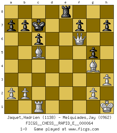 Last move : 1-0 2011 November 3 21:30:15 [Event "FICGS__CHESS__RAPID_E__000064"] [Site "FICGS"] [Date "2011.10.19"] [Round "1"] [White "Jaquet,Hadrien"] [Black "Melquiades,Jay"] [Result "1-0"] [WhiteElo "1138"] [BlackElo "0962"] 1.e4 e5 2.f4 d5 3.exd5 Qxd5 4.Nc3 Qd6 5.fxe5 Qxe5+ 6.Be2 Bg4 7.d4 Qe7 8.Nf3 Nf6 9.O-O Nh5 10.Re1 Nc6 11.h3 Bxf3 12.Bxf3 O-O-O 13.Rxe7 Bxe7 14.Bxh5 g6 15.Bf3 Nxd4 16.Nd5 Bc5 17.Kh1 Rhe8 18.Bg5 Rd6 19.Qf1 Nxc2 20.Rc1 c6 21.Nf6 Ne3 22.Bxe3 Rxf6 23.Bxc5 g5 24.Bg4+ Kc7 25.Qxf6 1-0 KGD : Falkbeer counter-gambit Kingside Castling by player White (move 9) Queenside Castling by player Black (move 12) Player White won this chess game. Follow this game move after move (download)In blitz, the Knight is stronger than the Bishop. (Vlastimil Hort) Ich rechne überhaupt nicht voraus. Ich gewinne auch so. (Robert James Fischer) Te sientas frente a un tablero y repentinamente tu corazón brinca. Tu mano tiembla al tomar una pieza y moverla. Pero lo que el Ajedrez te enseña es que tu debes permanecer ahí con calma y pensar de que si realmente es una buena idea o de que si hay otras ideas mejores. (Stanley Kubrick) L'ordinateur a tué l'originalité. Il n'y a plus guère d'aventures sur l'échiquier. (Jacob Murray) The good fighters of old first put themselves beyond the possibility of defeat, and then waited for an opportunity of defeating the enemy. (Sun Tzu)
