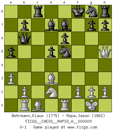 Last move : 0-1 2007 January 30 23:48:55 [Event "FICGS__CHESS__RAPID_A__000009"] [Site "FICGS"] [Date "2007.01.05"] [Round "1"] [White "Behrmann,Klaus"] [Black "Repa,Jason"] [Result "0-1"] [WhiteElo "1775"] [BlackElo "1862"] 1.e4 e6 2.d4 d5 3.e5 c5 4.c3 Qb6 5.Nf3 Nc6 6.a3 a5 7.Nbd2 cxd4 8.cxd4 Nxd4 9.Bd3 Nc6 10.O-O f6 11.Qa4 Bd7 12.Qh4 Be7 13.Qh5+ Kf8 14.Re1 Rc8 15.Rb1 fxe5 16.Nxe5 Nxe5 0-1 French : Advance variation Kingside Castling by player White (move 10) Player Black won this chess game. Follow this game move after move (download)Every Pawn is a potential Queen. (James Mason) Der Traum, für den ich lebe, ist der von einem freien Russland. Viele mögen sagen: Russland hat doch ein Parlament, einen gewählten Präsidenten. Aber ich spüre, dass in meiner Heimat die Angst wiederkehrt. Eine Angst, sich frei zu äußern, bestimmte Dinge zu tun (Garry Kasparov) Con el fin de mejorar tu juego, debes de estudiar los finales antes que todo, ya que mientras que los finales pueden ser estudiados y dominados por sí mismos, el juegomedio y la apertura deben de ser estudiados en relación con los finales. (José Raúl Capablanca) C'est la seule position que je connaisse où les deux camps sont mals. Propos prêtés à V. Anand. Begin at the beginning and go on till you come to the end; then stop. (Lewis Carrol, Alice in Wonderland)