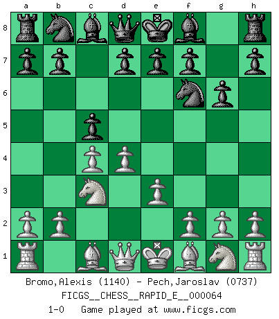 Last move : 1-0 2011 November 23 1:27:45 [Event "FICGS__CHESS__RAPID_E__000064"] [Site "FICGS"] [Date "2011.10.19"] [Round "1"] [White "Bromo,Alexis"] [Black "Pech,Jaroslav"] [Result "1-0"] [WhiteElo "1140"] [BlackElo "0737"] 1.d4 Nf6 2.c4 c5 3.e3 g6 4.Nc3 1-0 This chess game has been lost on time (started : 2011.10.19 10:43:14) Benoni defense Player White won this chess game. Follow this game move after move (download)You must take your opponent into a deep dark forest where 2+2=5, and the path leading out is only wide enough for one. (Mikhail Tal) Schach ist das Spiel, das die Verrückten gesund hält. (Albert Einstein) Los finales de Peón son del Ajedrez lo que el cesped es del Golf. (Cecil Purdy) Toute estimation doit être constamment réévaluée. (Jacob Estrin) If only people were all showed a certain minimum level of niceness; if only people didn't retract verbal draw offers (without draw box ticked) on ficgs; if only people didn't kill; if only people didn't run concentration / extermination camps, if only people didn't drop nuclear bombs on Hiroshima and Nagasaki, and so on - it would be a much more beautiful world. But sadly, things are not so... (Normajean Yates)