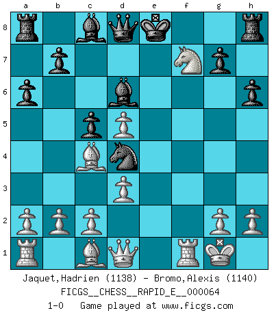 Last move : 1-0 2011 October 28 22:30:48 [Event "FICGS__CHESS__RAPID_E__000064"] [Site "FICGS"] [Date "2011.10.19"] [Round "1"] [White "Jaquet,Hadrien"] [Black "Bromo,Alexis"] [Result "1-0"] [WhiteElo "1138"] [BlackElo "1140"] 1.e4 c5 2.Nc3 Nc6 3.f4 e5 4.Nf3 d6 5.Bc4 h6 6.O-O Nf6 7.d3 a6 8.fxe5 dxe5 9.Nd5 Nxd5 10.exd5 Nd4 11.Nxe5 Bd6 12.Nxf7 1-0 Sicilian : Grand Prix attack Kingside Castling by player White (move 6) Player White won this chess game. Follow this game move after move (download)You sit at the board and suddenly your heart leaps. Your hand trembles to pick up the piece and move it. But what Chess teaches you is that you must sit there calmly and think about whether it's really a good idea and whether there are other better ideas. (Stanley Kubrick) Moralische Siege zählen nicht. (Savielly Grigorievitsch Tartakower) Peones: ellos son el alma de esta partida, solos forman el ataque y la defensa. (Philidor) Ce n'est pas pour s'amuser qu'il joue aux échecs : il célèbre un culte. (Vladimir Nabokov) If you ain't just a little scared when you enter a casino, you are either very rich or you haven't studied the games enough. (Pappy)
