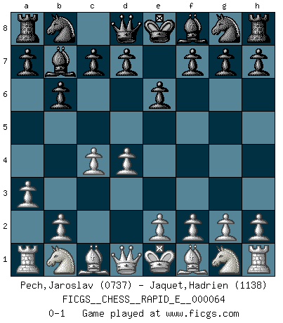 Last move : 0-1 2011 November 22 13:25:23 [Event "FICGS__CHESS__RAPID_E__000064"] [Site "FICGS"] [Date "2011.10.19"] [Round "1"] [White "Pech,Jaroslav"] [Black "Jaquet,Hadrien"] [Result "0-1"] [WhiteElo "0737"] [BlackElo "1138"] 1.d4 e6 2.c4 b6 3.a3 Bb7 0-1 This chess game has been lost on time (started : 2011.10.19 10:43:14) Queen's pawn : Keres defense Player Black won this chess game. Follow this game move after move (download)A Chess game is a dialogue, a conversation between a player and his opponent. Each move by the opponent may contain threats or be a blunder, but a player cannot defend against threats or take advantage of blunders if he does not first ask himself: What is my opponent planning after each move ? (Bruce A. Moon) Ich moechte nie einem Club beitreten, der Leute wie mich als Mitglieder aufnimmt. (Woody Allen) No hay un Gran Maestro de Ajedrez que sea normal; solo se diferencían ellos por la magnitud de su locura. (Viktor Korchnoi) Votre prénom est 'Tactique', votre deuxième prénom est 'Tactique' et votre nom est 'Tactique'. (Ken Smith) All art requires courage. (Anne Tucker)