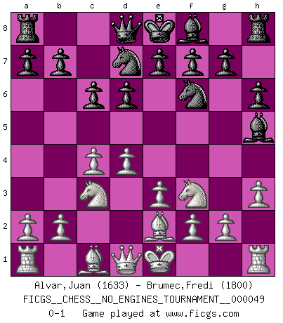 Last move : 0-1 2011 December 4 3:22:13 [Event "FICGS__CHESS__NO_ENGINES_TOURNAMENT__000049"] [Site "FICGS"] [Date "2011.10.19"] [Round "1"] [White "Alvar,Juan"] [Black "Brumec,Fredi"] [Result "0-1"] [WhiteElo "1633"] [BlackElo "1800"] 1.Nf3 Nf6 2.d4 d6 3.c4 c6 4.Nc3 Bg4 5.e3 Nbd7 6.h3 Bh5 7.Be2 h6 0-1 This chess game has been lost on time (started : 2011.10.19 14:25:2) Reti Opening Player Black won this chess game. Follow this game move after move (download)My opponents make good moves too. Sometimes I don't take these things into consideration. (Bobby Fischer) Schach verlangt totale Konzentration. (Robert James Fischer) No es suficiente ser un buen jugador, se debe también de jugar bién. (Siegbert Tarrasch) La vie est comme un jeu d'échecs : nous esquissons un plan, mais celui-ci est tributaire de ce que daignent faire l'adversaire aux échecs et le destin dans la vie. (Arthur Schopenhauer) A bird doesn't sing because it has an answer, it sings because it has a song. (Maya Angelou)
