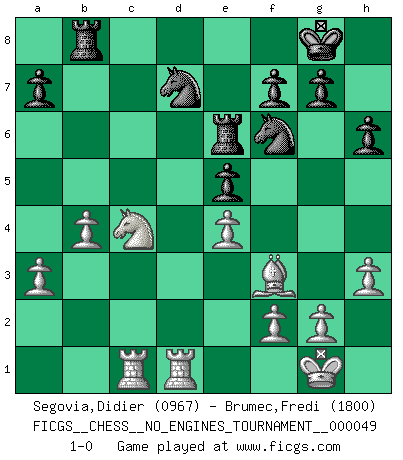 Last move : 1-0 2012 March 18 9:20:19 [Event "FICGS__CHESS__NO_ENGINES_TOURNAMENT__000049"] [Site "FICGS"] [Date "2011.10.19"] [Round "1"] [White "Segovia,Didier"] [Black "Brumec,Fredi"] [Result "1-0"] [WhiteElo "0967"] [BlackElo "1800"] 1.e4 d6 2.d4 c6 3.Nf3 Bg4 4.Be2 Nd7 5.h3 Bxf3 6.Bxf3 h6 7.O-O e5 8.c3 Be7 9.Na3 Ngf6 10.Nc4 b5 11.Ne3 O-O 12.dxe5 dxe5 13.Nf5 Bc5 14.b4 Bb6 15.Qd6 c5 16.Be3 Re8 17.Rfd1 Bc7 18.Qc6 Re6 19.Qxb5 Rb8 20.Qa4 cxb4 21.cxb4 Bb6 22.Bxb6 Rexb6 23.a3 Qc7 24.Rac1 Qb7 25.Nd6 Qa6 26.Qxa6 Rxa6 27.Ra1 Rab6 28.Nc4 Re6 29.Rac1 1-0 King's pawn Opening Kingside Castling by player White (move 7) Kingside Castling by player Black (move 11) Player White won this chess game. Follow this game move after move (download)Modern Chess is too much concerned with things like Pawn structure. Forget it, Checkmate ends the game. (Nigel Short) Stil? Ich habe keinen Stil! (Anatoly Karpov) El Ajedrez, como cualquier actividad creativa, solo puede existir a través del esfuerzo combinado de aquellos que tienen talento creativo y de aquellos que poseen la habilidad de organizar su trabajo creativo. (Mikhail Botvinnik) Les Echecs représentent une sphère d'idées créatrices basée sur la volonté des deux protagonistes. (Smyslov) No man has ever achieved immortality in his own life time. (Unknown)