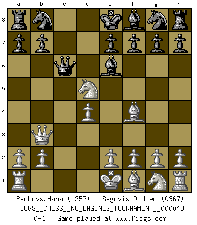Last move : 0-1 2011 December 13 4:18:48 [Event "FICGS__CHESS__NO_ENGINES_TOURNAMENT__000049"] [Site "FICGS"] [Date "2011.10.19"] [Round "1"] [White "Pechova,Hana"] [Black "Segovia,Didier"] [Result "0-1"] [WhiteElo "1257"] [BlackElo "0967"] 1.d4 d5 2.c4 c6 3.Nc3 Bg4 4.Qb3 Qc7 5.cxd5 cxd5 6.Nxd5 Qc6 7.Bf4 Be6 0-1 This chess game has been lost on time (started : 2011.10.19 14:25:2) QGD Slav defense Player Black won this chess game. Follow this game move after move (download)A thorough understanding of the typical mating continuations makes the most complicated sacrificial combinations leading up to them not only not difficult, but almost a matter of course. (Siegbert Tarrasch) Der Partner hat auch seine Existenzberechtigung. (Savielly Grigorievitsch Tartakower) El Ajedrez expande y enriquece tu mente. (Saudin Robovic) Les Cavaliers se révèlent fort utiles dans les positions fermées. D'habitude, les Fous sont un peu plus forts que les Cavaliers dans les positions ouvertes. Qu'on le veuille ou non, il restera toujours des exceptions ! Everything in life is luck. (Donald Trump)