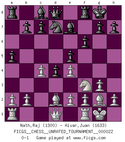 Last move : 0-1 2012 February 15 19:45:46 [Event "FICGS__CHESS__UNRATED_TOURNAMENT__000022"] [Site "FICGS"] [Date "2011.10.19"] [Round "1"] [White "Nath,Raj"] [Black "Alvar,Juan"] [Result "0-1"] [WhiteElo "1300"] [BlackElo "1633"] 1.c4 Nf6 2.Nc3 e5 3.d3 d5 4.Bd2 d4 5.Ne4 Nxe4 6.dxe4 a5 7.Nf3 Nd7 8.g3 Be7 9.Bg2 O-O 10.O-O f6 0-1 This chess game has been lost on time (started : 2011.10.19 18:20:40) English Opening Kingside Castling by player Black (move 9) Kingside Castling by player White (move 10) Player Black won this chess game. Follow this game move after move (download)When you don't know what to play, wait for an idea to come into your opponent's mind. You may be sure that idea will be wrong. (Siegbert Tarrasch) Ich hatte Angst gegen einen russischen Großmeister zu verlieren, und er befürchtete gegen einen kleinen Jungen zu verlieren. (über ein Remis gegen Juri Awerbach). (Robert James Fischer) Solo existe una cosa que Fischer hace en el Ajedrez sin placer: ¡perder!. (Boris Spassky) La vie et les Echecs sont tous les deux une lutte constante. (Lasker) The Internet is the first thing that humanity has build that humanity doesn't understand, the largest experiment in anarchy that we have ever had. (Eric Schmidt)