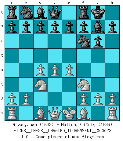 Last move : 1-0 2011 December 13 16:18:37 [Event "FICGS__CHESS__UNRATED_TOURNAMENT__000022"] [Site "FICGS"] [Date "2011.10.19"] [Round "1"] [White "Alvar,Juan"] [Black "Malish,Dmitriy"] [Result "1-0"] [WhiteElo "1633"] [BlackElo "1889"] 1.Nf3 Nf6 2.c4 g6 3.Nc3 Bg7 4.d4 O-O 5.e4 1-0 This chess game has been lost on time (started : 2011.10.19 18:20:40) Reti Opening Kingside Castling by player Black (move 4) Player White won this chess game. Follow this game move after move (download)Alekhine is a poet who creates a work of art out of something that would hardly inspire another man to send home a picture post card. (Max Euwe) Es ist peinlich, dass ich nie Weltmeister wurde. Es wäre leicht, Leonid Breschnjew als Ursache vorzuschieben, dessen Apparat den Vorzeigekommunisten Anatoli Karpow in allem unterstützte. Aber Garri Kasparow zum Beispiel, der ebenfalls von den Sowjets unerwünscht war, hat trotz der Widerstände den WM-Titel erobert. (Viktor Kortschnoi) Fischer sacrificó virtualmente todo lo que la mayoría de nosotros los 'debiles' (término que él usa) valoramos, respetamos y apreciamos por el amor de un astuto, a menudo hermoso tablero de juego, por el privilegio ambivalente de ser su mas grande maestro. (Paul Kollar) Les Echecs représentent une sphère d'idées créatrices basée sur la volonté des deux protagonistes. (Smyslov) It is not true that people stop pursuing dreams because they grow old, they grow old because they stop pursuing dreams. (Gabriel Garcia Marquez)