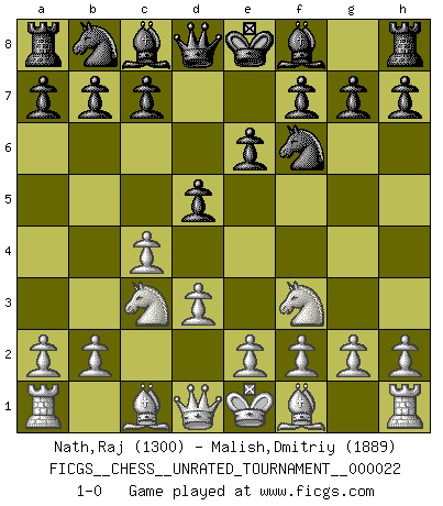 Last move : 1-0 2011 November 30 14:36:7 [Event "FICGS__CHESS__UNRATED_TOURNAMENT__000022"] [Site "FICGS"] [Date "2011.10.19"] [Round "1"] [White "Nath,Raj"] [Black "Malish,Dmitriy"] [Result "1-0"] [WhiteElo "1300"] [BlackElo "1889"] 1.c4 e6 2.Nf3 d5 3.d3 Nf6 4.Nc3 1-0 This chess game has been lost on time (started : 2011.10.19 18:20:40) English Opening : Agincourt variation Player White won this chess game. Follow this game move after move (download)Is Bobby Fischer quite sane ? (Salo Flohr) Wenn Schach ein enormer Dschungel ist, der seine Myriaden von Geheimnissen nicht preisgeben will, dann sind Computer die Kettensägen einer gewaltigen ökologisch unsensiblen Nutzholzfirma. (Nigel Short) Antes de los Finales, los dioses han colocado el Juego Medio. (Siegbert Tarrasch) Fischer est le meilleur joueur du monde et Karpov n'est qu'un joueur de bistrot. (Garry Kasparov, agé de 16 ans) Nowadays, anyone who cannot speak English and is incapable of using the Internet is regarded as backward. (Al-Waleed bin Talal)