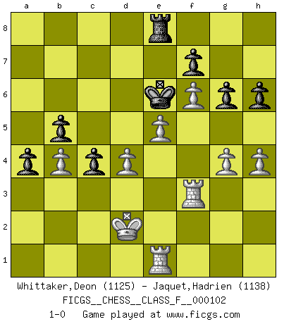 Last move : 1-0 2012 January 1 11:18:34 [Event "FICGS__CHESS__CLASS_F__000102"] [Site "FICGS"] [Date "2011.10.19"] [Round "1"] [White "Whittaker,Deon"] [Black "Jaquet,Hadrien"] [Result "1-0"] [WhiteElo "1125"] [BlackElo "1138"] 1.d4 e6 2.c4 d5 3.Nc3 Bb4 4.a3 Bxc3+ 5.bxc3 dxc4 6.e4 b5 7.a4 c6 8.Ba3 Ne7 9.e5 O-O 10.Nf3 Re8 11.Qc2 Ng6 12.Qe4 Qd5 13.Qxd5 exd5 14.axb5 cxb5 15.g3 Bf5 16.Bg2 Nd7 17.O-O a5 18.Nh4 Nxh4 19.Bxd5 Ng6 20.Bxa8 Rxa8 21.Rfe1 Be6 22.f4 Ne7 23.Bxe7 g6 24.Bb4 a4 25.Kg2 Nb6 26.h4 Nd5 27.Kf3 Nxb4 28.cxb4 Rd8 29.Ke3 Bd5 30.Rec1 Kg7 31.g4 h6 32.Kd2 Re8 33.Ra3 Kf8 34.Re1 Ke7 35.f5 Bf3 36.f6+ Ke6 37.Rxf3 1-0 Queen's pawn Kingside Castling by player Black (move 9) Kingside Castling by player White (move 17) Player White won this chess game. Follow this game move after move (download)It's just you and your opponent at the board and you're trying to prove something. (Bobby Fischer) Ich liebe den Moment, wenn ich das Ego meines Gegenüber breche. (Robert James Fischer) El juego de Fischer siempre fue nítido, racional y brillante. Uno de los mejores por siempre. (Dave Regis) Il s'avisa de me proposer d'apprendre les échecs qu'il jouait un peu... me voilà forcené des échecs. J'achète un échiquier, je m'enferme dans ma chambre, j'y passe des jours et des nuits à vouloir apprendre par cur toutes les parties. (Jean-Jacques Rousseau, Confessions) I fear not the man who has practiced 10,000 kicks once, but I fear the man who has practiced one kick 10,000 times. (Bruce Lee)