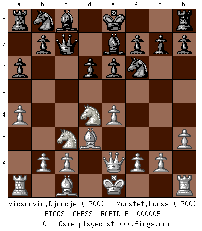 Last move : 1-0 2006 June 19 23:22:32 [Event "FICGS__CHESS__RAPID_B__000005"] [Site "FICGS"] [Date "2006.05.10"] [Round "1"] [White "Vidanovic,Djordje"] [Black "Muratet,Lucas"] [Result "1-0"] [WhiteElo "1700"] [BlackElo "1700"] 1.e4 c5 2.Nf3 d6 3.h3 Nf6 4.Nc3 a6 5.a4 e6 6.d4 cxd4 7.Nxd4 Qc7 8.Bd3 Be7 9.Qe2 1-0 This chess game has been lost on time (started : 2006.05.10 11:52:43) Sicilian Player White won this chess game. Follow this game move after move (download)The enormous mental resilience, without which no Chess player can exist, was so much taken up by Chess that he could never free his mind of this game. (Albert Einstein) Dieses schreckliche Gefühl, dass ich gegen eine Maschine spielte, die niemals Fehler macht, zerschmetterte meinen Widerstand. (Mark Taimanov) No hay otro maestro que tenga una voluntad terrífica de ganar. Al tablero, el irradía peligro y aún los oponentes mas fuertes tienden a congelarse como liebres cuando olfatean a una pantera. Aún sus debilidades son peligrosas. Con las blancas, su juego de apertura es predecible - te es posible hacer planes en su contra - pero es tan fuerte que tus planes casi nunca funcionan. En el juego medio, su precisión e invención son fabulosas y en finales, tú simplemente no le puedes vencer. (Experto Alemán anónimo) Celui qui prend des risques peut perdre, celui qui n'en prend pas perd toujours. (Xavier Tartacover) Quotation,n.: The act of repeating erroneously the words of another. The words erroneously repeated. (Ambrose Bierce, The Devil's Dictionary)