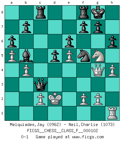 Last move : 0-1 2011 November 12 18:31:21 [Event "FICGS__CHESS__CLASS_F__000102"] [Site "FICGS"] [Date "2011.10.19"] [Round "1"] [White "Melquiades,Jay"] [Black "Neil,Charlie"] [Result "0-1"] [WhiteElo "0962"] [BlackElo "1073"] 1.e4 e6 2.d4 d5 3.e5 c5 4.Nf3 Nc6 5.Bd2 Qb6 6.b3 cxd4 7.a4 Bd7 8.a5 Qc7 9.Bb5 a6 10.Bxc6 Bxc6 11.Bg5 h6 12.Qxd4 Be7 13.Bxe7 Nxe7 14.Nc3 Nf5 15.Qg4 O-O 16.h4 Rac8 17.b4 Bb5 18.Ng5 Qxc3+ 19.Kd1 Qxa1+ 20.Kd2 Qc3+ 0-1 French : Advance, Nimzovich system Kingside Castling by player Black (move 15) Player Black won this chess game. Follow this game move after move (download)It is always better to sacrifice your opponent's men. (Savielly Tartakower) Man kann eine Schachpartie nur gewinnen, wenn das Gleichgewicht gestört ist. In einer Stellung mit ungestörtem Gleichgewicht ist auch das größte Genie hilflos - in der Stellung steckt dann eben kein genialer Einfall. (Wilhelm Steinitz) Yo siempre he tenido un ligero sentimiento de lástima por una persona que no tiene conocimiento del Ajedrez. (Siegbert Tarrasch) Même un GMI sait rarement calculer sur plus de cinq coups une attaque à sacrifices. (Rudolf Spielmann) The only thing that overcomes hard luck is hard work. (Harry Golden)