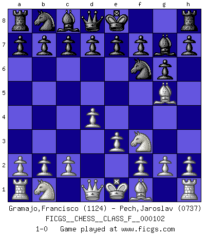 Last move : 1-0 2011 November 29 16:5:29 [Event "FICGS__CHESS__CLASS_F__000102"] [Site "FICGS"] [Date "2011.10.19"] [Round "1"] [White "Gramajo,Francisco"] [Black "Pech,Jaroslav"] [Result "1-0"] [WhiteElo "1124"] [BlackElo "0737"] 1.Nf3 Nf6 2.d4 g6 3.Bg5 Bg7 4.e3 1-0 Reti Opening Player White won this chess game. Follow this game move after move (download)Chess is a fighting game which is purely intellectual and includes chance. (Richard Reti) Im Leben werden Partien nie so unstrittig gewonnen wie im Spiel (Emanuel Lasker) De todos mis libros Rusos, la defensa contiene y difunde el 'calor' mas grande que pudiese verse extraño al observar lo supremamente abstracto que el Ajedrez supuestamente es. (Vladimir Nabokov) Un footballeur joue avec ses pieds, parfois avec sa tête. Un joueur d'échecs ne joue qu'avec sa tête. Et quand il ne joue plus, il meurt. (Jacob Murray) A person who never made a mistake never tried anything new. (Albert Einstein)