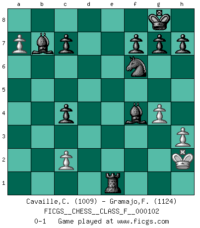 Last move : 0-1 2011 October 21 22:22:35 [Event "FICGS__CHESS__CLASS_F__000102"] [Site "FICGS"] [Date "2011.10.19"] [Round "1"] [White "Cavaille,Cedric"] [Black "Gramajo,Francisco"] [Result "0-1"] [WhiteElo "1009"] [BlackElo "1124"] 1.e4 Nc6 2.Nf3 d6 3.Bc4 e5 4.d4 exd4 5.Nxd4 Nf6 6.Nxc6 bxc6 7.Nc3 Be7 8.O-O O-O 9.b4 a5 10.bxa5 Rxa5 11.a4 d5 12.exd5 cxd5 13.Bg5 dxc4 14.Qxd8 Rxd8 15.Rfd1 Rxd1+ 16.Nxd1 Rxg5 17.a5 Re5 18.Nc3 Bb4 19.a6 Bxc3 20.a7 Bxa1 21.g4 Bb7 22.h3 Re1+ 23.Kh2 Be5+ 24.f4 Bxf4+ 0-1 KP : Nimzovich defense Kingside Castling by player White (move 8) Kingside Castling by player Black (move 8) Player Black won this chess game. Follow this game move after move (download)We don't really know how the game was invented, though there are suspicions. As soon as we discover the culprits, we'll let you know. (Bruce Pandolfini) Die jungen Leute sollen verstehen, dass sie noch etwas von mir lernen können und müssen. (Viktor Kortschnoi) Una partida de Ajedrez se divide en 3 etapas: la primera cuando piensas que tienes la ventaja, la segunda cuando crees que tienes la ventaja y la tercera... ¡cuando te das cuenta que vas a perder!. (Savielly Tartakower) Même si l'adversaire joue le coup analysé précédemment, recommencez l'analyse en voyant la nouvelle position. Première règle de Blumenfeld Some people are so afraid to die that they never begin to live. (Henry Van Dyke)