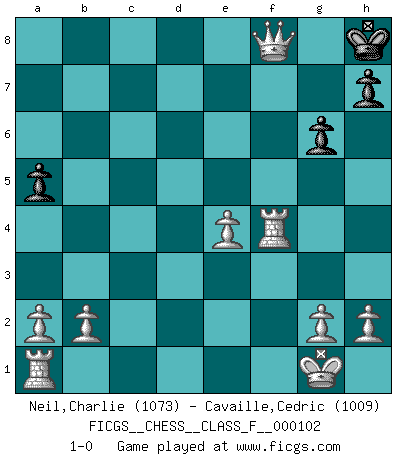 Last move : 1-0 2011 November 6 23:22:49 [Event "FICGS__CHESS__CLASS_F__000102"] [Site "FICGS"] [Date "2011.10.19"] [Round "1"] [White "Neil,Charlie"] [Black "Cavaille,Cedric"] [Result "1-0"] [WhiteElo "1073"] [BlackElo "1009"] 1.d4 g6 2.e4 Bg7 3.c3 d6 4.Be3 Nf6 5.Bd3 Nbd7 6.Nf3 O-O 7.Nbd2 e5 8.Nc4 a6 9.O-O b5 10.Na5 c5 11.dxc5 Nxc5 12.Bxc5 dxc5 13.Nc6 Qd6 14.Na5 Nd7 15.c4 bxc4 16.Nxc4 Nb6 17.Nxd6 c4 18.Nxc4 Nxc4 19.Bxc4 Be6 20.Bxe6 fxe6 21.Qb3 Rab8 22.Qxe6+ Rf7 23.Ng5 R8b7 24.Qc8+ Bf8 25.Nxf7 Rxf7 26.Qe6 a5 27.f4 exf4 28.Rxf4 Bg7 29.Qxf7+ Kh8 30.Qe8+ Bf8 31.Qxf8+ 1-0 Modern defense Kingside Castling by player Black (move 6) Kingside Castling by player White (move 9) Player White won this chess game. Follow this game move after move (download)In the perfect Chess combination as in a first-rate short story, the whole plot and counter-plot should lead up to a striking finale, the interest not being allayed until the very last moment. (Yates and Winter) Offensichtlich kennt Kasparow nichts anderes als Schach, und ich könnte 500 weitere Spieler dieser Sorte benennen. (Judith Polgar) El Ajedrez es una guerra en un tablero. El objetivo es aplastar la mente del oponente. (Bobby Fischer) Si je n'étais pas joueur d'échecs, je serais le meilleur dans quelque chose d'autre. (Anatoli Karpov) A journey of a thousand sites begins with a single click. (Author unknown)