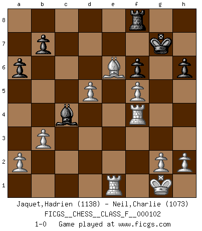 Last move : 1-0 2011 November 22 20:41:59 [Event "FICGS__CHESS__CLASS_F__000102"] [Site "FICGS"] [Date "2011.10.19"] [Round "1"] [White "Jaquet,Hadrien"] [Black "Neil,Charlie"] [Result "1-0"] [WhiteElo "1138"] [BlackElo "1073"] 1.e4 e6 2.f4 c5 3.Nf3 Nc6 4.Bc4 a6 5.d4 cxd4 6.Nxd4 Bb4+ 7.c3 Nxd4 8.Qxd4 Be7 9.O-O Nf6 10.f5 d5 11.exd5 Qc7 12.Bf4 Bd6 13.Bxd6 Qxd6 14.dxe6 Qxd4+ 15.cxd4 O-O 16.exf7+ Kh8 17.Nc3 Bd7 18.Rae1 Rac8 19.Bb3 h6 20.Nd5 Rc2 21.Nxf6 gxf6 22.Bxc2 Rxf7 23.Rf4 Kg7 24.Bb3 Rf8 25.Be6 Bb5 26.d5 Bc4 27.b3 1-0 French : Labourdonnais variation Kingside Castling by player White (move 9) Kingside Castling by player Black (move 15) Player White won this chess game. Follow this game move after move (download)Morphy was probably the greatest genius of them all. (Bobby Fischer) Ich las kürzlich ein Buch von Nietzsche. Er sagte Religion verdumme nur die Menschen. Ich stimme zu. (Robert James Fischer) Cuando tu no sabes absolutamente que mas hacer, es tiempo de entrar en pánico. (John van der Wiel) J'apprécie les joueurs d'est-indienne, c'est grâce à eux que je nourris ma famille depuis tant d'années. (Petrosian) No enterprise is more likely to succeed than one concealed from the enemy until it is ripe for execution. (Niccolo Machiavelli)
