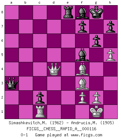 Last move : 0-1 2012 January 13 20:46:29 [Event "FICGS__CHESS__RAPID_A__000116"] [Site "FICGS"] [Date "2011.10.20"] [Round "1"] [White "Simashkevitch,Mykola"] [Black "Andrucis,Maris"] [Result "0-1"] [WhiteElo "1962"] [BlackElo "1905"] 1.e4 d5 2.exd5 Qxd5 3.Nc3 Qd6 4.d4 a6 5.Nge2 Nf6 6.Bf4 Qb6 7.Na4 Qa5+ 8.c3 Nbd7 9.b4 Qf5 10.Bxc7 Nd5 11.Bg3 g6 12.a3 b5 13.c4 bxc4 14.Rc1 N5b6 15.Nc5 Bh6 16.Rc3 Bg7 17.Rf3 Qd5 18.Rf4 Qc6 19.Nc3 e5 20.Re4 O-O 21.Nxd7 Bxd7 22.dxe5 Rae8 23.Qe2 Bf5 24.Re3 a5 25.Qb2 axb4 26.axb4 Nd7 27.Be2 Nxe5 28.O-O Nd3 29.Qd2 Nxb4 30.Bf3 Qa6 31.Ne4 Bxe4 32.Qxb4 Bd3 33.Rxe8 Rxe8 34.Rc1 c3 35.Bf4 c2 36.h4 Bf8 37.Qd4 Bf5 38.h5 Qa3 0-1 Scandinavian : Pytel-Wade variation Kingside Castling by player Black (move 20) Kingside Castling by player White (move 28) Player Black won this chess game. Follow this game move after move (download)A thorough understanding of the typical mating continuations makes the most complicated sacrificial combinations leading up to them not only not difficult, but almost a matter of course. (Siegbert Tarrasch) Schach wird sich dank seiner hohen kulturellen Tradition immer durchsetzen. In näherer Zukunft womöglich sogar als Gegenreaktion auf die maßlose Reizüberflutung im Freizeit- und Spielbereich. (Garry Kasparov) Un jugador que trata de regresar una movida en el Ajedrez es un futuro carterista. (Richard Fenton) On peut tirer plus d'utilité d'une partie perdue que de 100 parties gagnées. (Capablanca) There is a computer disease that anybody who works with computers knows about. It's a very serious disease and it interferes completely with the work. The trouble with computers is that you 'play' with them ! (Richard P. Feynman)