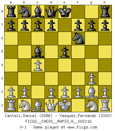 Last move : 0-1 2011 November 24 13:38:57 [Event "FICGS__CHESS__RAPID_A__000116"] [Site "FICGS"] [Date "2011.10.20"] [Round "1"] [White "Canteli,Daniel"] [Black "Vasquez,Fernando"] [Result "0-1"] [WhiteElo "2086"] [BlackElo "2002"] 1.c4 e5 2.g3 Nf6 3.Bg2 Bc5 0-1 This chess game has been lost on time (started : 2011.10.20 13:23:58) English Opening Player Black won this chess game. Follow this game move after move (download)All my games are real. (Bobby Fischer) Schach ist ein Reich, wo sich die menschliche Phantasie frei entfalten kann. (David Bronstein) El Ajedrez, como la música, como el amor, tiene el poder de hacer feliz a la gente. (Siegbert Tarrasch) Les échecs, c'est la lutte contre l'erreur. (Johannes Zukertort) Shallow men believe in luck. Strong men belive in cause and effect. (Ralph Waldo Emerson)