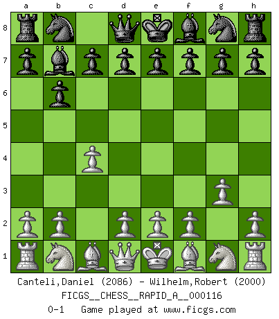 Last move : 0-1 2011 November 22 1:25:52 [Event "FICGS__CHESS__RAPID_A__000116"] [Site "FICGS"] [Date "2011.10.20"] [Round "1"] [White "Canteli,Daniel"] [Black "Wilhelm,Robert"] [Result "0-1"] [WhiteElo "2086"] [BlackElo "2000"] 1.c4 b6 2.g3 Bb7 0-1 This chess game has been lost on time (started : 2011.10.20 13:23:58) English Opening Player Black won this chess game. Follow this game move after move (download)Pawns: they are the soul of this game, they alone form the attack and defense. (Philidor) Ein Kibitz ist einer, der deinem Gegner gute Ratschläge gibt. (Andrew Soltis) El Ajedrez era la lengua materna de Capablanca. (Reti) Donnez-moi un Cavalier en 6e et je gagnerais toutes mes parties. (Steinitz) The various flowers seem good to different people. (Chinese proverb)