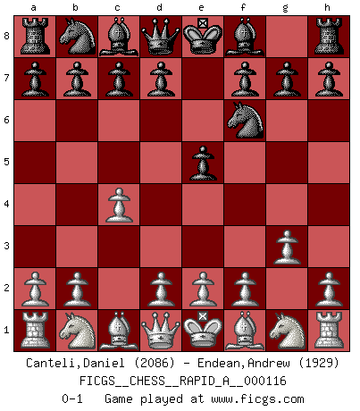 Last move : 0-1 2011 November 22 1:25:52 [Event "FICGS__CHESS__RAPID_A__000116"] [Site "FICGS"] [Date "2011.10.20"] [Round "1"] [White "Canteli,Daniel"] [Black "Endean,Andrew"] [Result "0-1"] [WhiteElo "2086"] [BlackElo "1929"] 1.c4 e5 2.g3 Nf6 0-1 This chess game has been lost on time (started : 2011.10.20 13:23:58) English Opening Player Black won this chess game. Follow this game move after move (download)Why must I lose to this idiot ? (Aron Nimzovich) Mutter, ich bin eben Ex-Weltmeister geworden. --beim nach Hause Kommen nach dem Verlust des WM-Titels an Mihail Botvinnik -- (Mikhail Nekhemyevich Tal) El jugador táctico debe saber que hacer cuando algo se debe de hacer. El estratégico debe saber que hacer cuando nada se debe de hacer. (Savielly Tartakover) Je ne crois pas en la psychologie, je crois aux bons coups. (Robert Fischer) Players are not good because they find tactics, it is about the way to find the positions in which those tactics are hidden. (Luc-Olivier Leclerc)