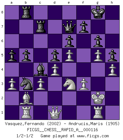Last move : 1/2-1/2 2012 January 17 21:45:53 [Event "FICGS__CHESS__RAPID_A__000116"] [Site "FICGS"] [Date "2011.10.20"] [Round "1"] [White "Vasquez,Fernando"] [Black "Andrucis,Maris"] [Result "1/2-1/2"] [WhiteElo "2002"] [BlackElo "1905"] 1.e4 e6 2.d4 d5 3.e5 c5 4.c3 Qb6 5.Nf3 Nc6 6.Bd3 cxd4 7.cxd4 Bd7 8.Bc2 Nb4 9.Nc3 Nxc2+ 10.Qxc2 Ne7 11.Bf4 Rc8 12.O-O Nf5 13.Rfd1 Bb4 14.Rab1 h6 15.Qd3 O-O 16.g4 Ne7 17.a3 Bxc3 18.bxc3 Qc7 19.g5 h5 20.Nh4 Ba4 21.Rdc1 g6 22.h3 b5 23.Kh2 Nc6 24.Rg1 Na5 25.Rg3 Qc4 26.Qd2 Qc6 27.Ng2 Rc7 28.Qc1 Qd7 29.h4 Qe7 30.Qe1 a6 31.Bc1 Bc2 32.Rb2 Be4 33.f3 Bd3 34.Rd2 Bf5 35.Ne3 Rfc8 36.Ra2 Bd3 37.Bb2 Qe8 38.Qd1 Bc4 39.Ra1 Nb3 40.Rb1 Qe7 41.Nc2 a5 42.Rg1 Rb7 43.Kg3 R7b8 44.Ne3 Rc6 45.Kg2 Rc7 1/2-1/2 French : Advance variation Kingside Castling by player White (move 12) Kingside Castling by player Black (move 15) This chess game ended in a draw. Follow this game move after move (download)Becoming successful at Chess allows you to discover your own personality. That's what I want for the kids I teach. (Saudin Robovic) Die größte Kunst beim Schach besteht darin dem Gegner nicht zu zeigen was er tun kann. (Garry Kasparov) Cada Peón es potencialmente una Reina. (James Mason) Même si l'adversaire joue le coup analysé précédemment, recommencez l'analyse en voyant la nouvelle position. Première règle de Blumenfeld Sometimes it pays to stay in bed in Monday, rather than spending the rest of the week debugging Monday's code. (Dan Salomon)