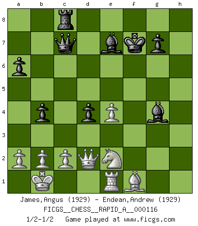 Last move : 1/2-1/2 2011 November 26 11:42:45 [Event "FICGS__CHESS__RAPID_A__000116"] [Site "FICGS"] [Date "2011.10.20"] [Round "1"] [White "James,Angus"] [Black "Endean,Andrew"] [Result "1/2-1/2"] [WhiteElo "1929"] [BlackElo "1929"] 1.e4 c5 2.Nf3 d6 3.d4 cxd4 4.Nxd4 Nf6 5.Nc3 a6 6.Be3 e6 7.f3 b5 8.Qd2 Nbd7 9.g4 b4 10.Nce2 h6 11.O-O-O Qc7 12.h4 d5 13.Bf4 e5 14.Bh2 dxe4 15.g5 hxg5 16.hxg5 Rxh2 17.Rxh2 exd4 18.Rh4 Ng4 19.Rxg4 Nc5 20.Rxe4+ Nxe4 21.fxe4 Bg4 22.g6 Be7 23.gxf7+ Kxf7 24.Kb1 Rc8 25.Re1 1/2-1/2 Sicilian : Najdorf, Byrne (English) attack Queenside Castling by player White (move 11) This chess game ended in a draw. Follow this game move after move (download)I'm not afraid of Spassky. The world knows I'm the best. You don't need a match to prove it. (Bobby Fischer) Am wohlsten fühle ich mich, wenn ich sehe, wie sich mein Gegner im Todeskampf windet. (Robert James Fischer) Los problemas de Ajedrez exigen del compositor las mismas virtudes que caracterizan todo el arte de valor: originalidad, invención, concisión, armonía, complejidad e insinceridad explendida. (Vladimir Nabokov) Une platitude souvent récitée à propos des Echecs est qu'une des choses les plus difficiles à réaliser est de gagner une position gagnante. Cela ne manque pas de sens mais, pour ma part, j'ai toujours trouvé plus difficile de gagner une position perdante. (Tim Krabbe) Now be brave and don't look back. Don't look back. (Shmi Skywalker in Star Wars ep.1)
