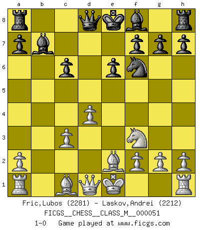 Last move : 1-0 2012 February 21 19:50:8 [Event "FICGS__CHESS__CLASS_M__000051"] [Site "FICGS"] [Date "2011.10.21"] [Round "1"] [White "Fric,Lubos"] [Black "Laskov,Andrei"] [Result "1-0"] [WhiteElo "2281"] [BlackElo "2212"] 1.Nf3 d5 2.d4 Nf6 3.c4 c6 4.Nc3 e6 5.e3 Nbd7 6.Bd3 dxc4 7.Bxc4 b5 8.Be2 Bb7 9.e4 b4 10.e5 bxc3 11.exf6 Nxf6 12.bxc3 1-0 Reti Opening Player White won this chess game. Follow this game move after move (download)In a gambit you give up a Pawn for the sake of getting a lost game. (Samuel Standige Boden) Sehr viele beherrschen heutzutage das große Einmalseins des Schachspiels und kennen sogar dessen Logarithmentafeln auswendig - deshalb sollte man hin und wieder zu beweisen trachten, dass zwei mal zwei auch fünf sein kann. (Mikhail Nekhemyevich Tal) El Ajedrez es un regaderazo frío para la mente. (Sir John Simon) Les échecs c'est le défi de l'alpiniste, toujours plus haut, prêt à tout pour monter à l'assaut du Roi ennemi. Les échecs, c'est de la musique en mouvement, un ballet majestueux pour les yeux. C'est de la poésie composée par les fantômes du passé qui au même titre que Rimbaud ou Verlaine méritent notre admiration. Les échecs, c'est de la peinture ou le moindre mouvement modifie le tableau pour en faire un Picasso ou un Van Gogh. Les échecs, c'est tout et rien, c'est la vie et la mort. Jjulie33 sur le forum de France-Echecs. Treat your password like your toothbrush. Don't let anybody else use it, and get a new one every six months. (Clifford Stoll)