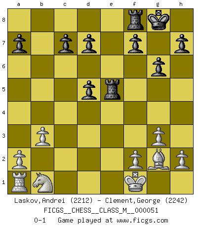 Last move : 0-1 2012 January 23 18:33:36 [Event "FICGS__CHESS__CLASS_M__000051"] [Site "FICGS"] [Date "2011.10.21"] [Round "1"] [White "Laskov,Andrei"] [Black "Clement,George"] [Result "0-1"] [WhiteElo "2212"] [BlackElo "2242"] 1.e4 e5 2.Nf3 Nc6 3.d4 exd4 4.Nxd4 Nf6 5.Nxc6 bxc6 6.e5 Qe7 7.Qe2 Nd5 8.c4 Ba6 9.b3 g6 10.g3 Bg7 11.Bb2 O-O 12.Bg2 Rae8 13.O-O Bxe5 14.Bxe5 Qxe5 15.Qxe5 Rxe5 16.cxd5 Bxf1 17.Kxf1 cxd5 0-1 This chess game has been lost on time (started : 2011.10.21 4:55:36) Scotch : Mieses variation Kingside Castling by player Black (move 11) Kingside Castling by player White (move 13) Player Black won this chess game. Follow this game move after move (download)Some part of a mistake is always correct. (Savielly Tartakover) Die Auseinandersetzung mit Karpow war politisch geprägt. Er stand für das kommunistische System, wurde von dessen Repräsentanten gehätschelt. Ich war der Oppositionelle. Jeder Schachweltmeister spiegelt auch die gesellschaftlichen Verhältnisse wider. Kramnik steht für die Börsen-Generation des Neuen Markts, ideologiefrei, zahlenfixiert. (Garry Kasparov) El Ajedrez es parte de la cultura, y si una cultura esta en decadencia, entonces también el Ajedrez declinará. (Mikhail Botvinnik) Les Echecs sont et restent toujours un combat, un combat intégral comme la boxe, la lutte ou un autre sport, et où il doit y avoir un vainqueur et un vaincu. (Joseph Emil Diemer) All the biggest technological inventions created by man - the airplane, the automobile, the computer - says little about his intelligence, but speaks volumes about his laziness. (Mark Kennedy)