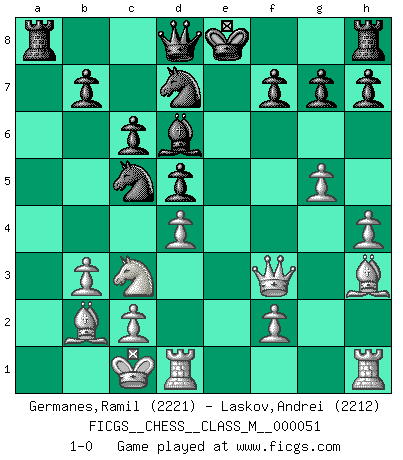 Last move : 1-0 2012 January 23 6:34:27 [Event "FICGS__CHESS__CLASS_M__000051"] [Site "FICGS"] [Date "2011.10.21"] [Round "1"] [White "Germanes,Ramil"] [Black "Laskov,Andrei"] [Result "1-0"] [WhiteElo "2221"] [BlackElo "2212"] 1.b3 d5 2.Bb2 Nf6 3.Nf3 c6 4.e3 Bg4 5.h3 Bxf3 6.Qxf3 Nbd7 7.Nc3 e5 8.g4 Nc5 9.O-O-O a5 10.g5 Nfd7 11.h4 a4 12.Bh3 axb3 13.axb3 Bd6 14.d4 exd4 15.exd4 1-0 This chess game has been lost on time (started : 2011.10.21 4:55:36) Nimzovich-Larsen attack : Classical variation Queenside Castling by player White (move 9) Player White won this chess game. Follow this game move after move (download)A great player and a great example for many. His book My 60 Memorable Games had a big impact on me. It is a shame he didn't continue to enrich the world of chess with his unparalleled understanding after 1972. (Jan Timman, about Bobby Fischer's death) Ich organisiere ein großes Turnier, was mich etwa 120000 Dollar kostet. Ich denke, das ist das erste Mal in der Schachgeschichte, daß ein Schachgroßmeister auch als Mäzen auftritt. (Miguel Najdorf) Las piezas de Ajedrez son los bloques del alfabeto que moldean los pensamientos; y esos pensamientos, aunque hagan un diseño visual en el tablero, expresan abstractamente su belleza como un poema. (Marcel Duchamp) Les échecs, c'est l'art d'analyser. (Mikhail Botvinnik) Every now and then a man's mind is stretched by a new idea and never shrinks back to its former dimensions. (Oliver Wendell Holmes, Sr.)